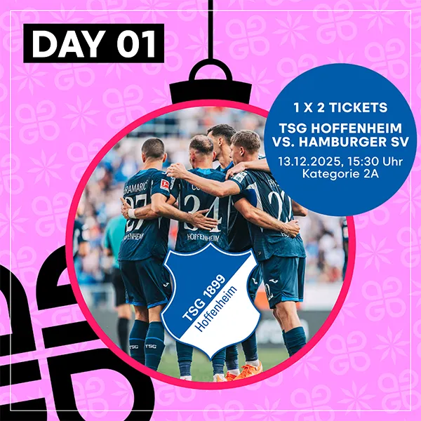 Im Türchen Nummer 1 verlosen wir 1 x 2 Tickets für das Spiel TSG Hoffenheim vs. Hamburger SV am 13.12.2025 in der Ticketkategorie 2A.